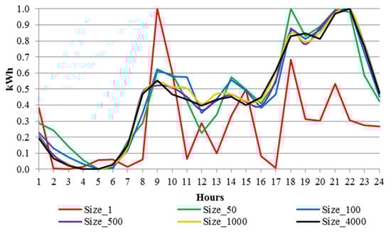 Some characteristics of the underlying data are presented in Figure 1, where the normalized consumption observed at different aggregation levels is visualized. Aggregation reduces the variability in electricity consumption resulting in increasingly smooth load shapes when at least 100 households are considered.