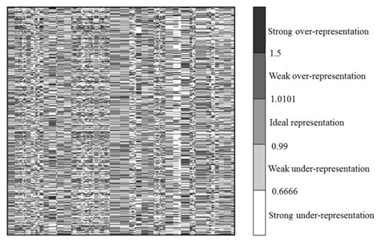 The next step was to compute over-representation ratios for each field (cell) of the table with households and the attributes describing them. For a given data matrix with non-negative values, a visualization using over-representation map is possible, in the same way as a contingency table. However, instead of frequency the value of -th feature for -th household is used. Subsequently, it is compared in a contingency table with the corresponding neutral or fair representation of where , . The ratio of the expression is called the over-representation. An over-representation surface over a unit square is then divided into cells situated in rows and columns, and the area of cells placed in row and column is assumed to be equal to fair representation of normalized . Based on the over-representation ratios, the over-representation map for the initial raw data can be constructed. The color intensity of each cell in the map is the result of the comparison between two values: (1) the real value of the measure connected to the underlying cell; (2) the expected value of the measure. In Figure 2 there is an initial over-representation map for the analyzed data presented. The colors of the cells in the map are grouped into three classes representing different properties: