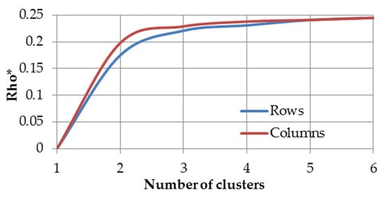 In order to reveal the structural trends in data, the following step was to apply the grade analysis to measure the dissimilarity between analyzed data distributions—households and feature dimensions. The grade analysis was conducted based on Spearman’s , used as the total diversity index. The value of strongly depends on the mutual order of the rows and the columns and therefore, to calculate , the concentration indexes of differentiation between the distributions were used. The basic GCA procedure is executed through permuting the rows and columns of a table in order to maximize the value of . After each sorting, the value increases and the map becomes more similar to the ideal one. As presented on the maps, the darkest fields are placed in the upper-left and the lower-right corners while the rest of the fields are assigned according to the following property: the farther from the diagonal towards the two other map corners (the lower-left and the upper-right ones) the lighter gray (or white) color the fields have.
