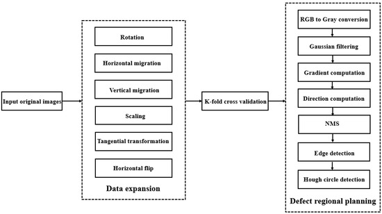 There are two purposes of image pre-processing: one is to enhance image quality to ensure sharp contrast and filter out noise, such as adopting histogram equalization and gray scale transformation to enhance contrast, or adopting methods such as median filtering and adaptive filtering to remove noise. The second is to segment the image to facilitate subsequent feature extraction, such as threshold segmentation, edge segmentation and region segmentation. In this paper, data enhancement and defect area planning were carried out in view of the features of a container mouth in a filling line, such as stability, monotonous shape and a limited number of images. The pre-processing flow is illustrated in Figure 1.