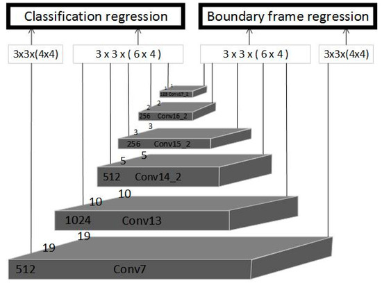This model supports fast and accurate detection because the structure of MobileNet reduces the complexity of computing. However, the structure of Pw changes the distribution of output data of Dw. This may cause a loss of precision. To solve this problem, the fully-connected layers were abandoned, and eight standard convolutional layers were added with the aim to widen the receptive field of the feature image, adjust the data distribution and enhance the translation invariance of the classification task. To prevent the disappearance of the gradient, the BN layer and activation function ReLU6 were introduced to each layer of the added structure. In addition, the two-layer feature image in MobileNet and the four-layer feature image in the added standard convolutional layers constituted a feature image pyramid (Figure 5). Kernels 3 × 3 in size were adopted as the convolutional kernels to convolve selected feature maps. The convolutional results were taken as the final feature for classification regression and bounded box regression.