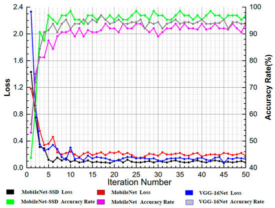 The loss function and the accuracy of the proposed MobileNet-SSD surface defect detection algorithm on the test set (Figure 7) were compared to those of the VGGNet [28], an excellent detection network in 2014 ImageNet and MobileNet. The three algorithms were trained via migration learning and data enhancement. The training parameters and results are shown in Table 3.