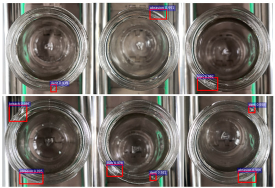 When the filling line was in operation, the container passed by the image acquisition device within a certain distance, triggering the CCD camera to take photos. The defect detection network performed forward operation. If there were defects in the image, the alarm would buzz and the defect type and location were identified by the host (Figure 8). The single forward operation of the network was at the rate of 0.12 s/image.