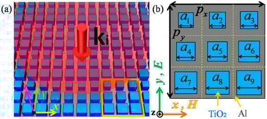 (a) Schematic diagram of our combined metasurface absorber and (b) an enlarged view of one unit cell (circled by a yellow box in Figure 1a).
