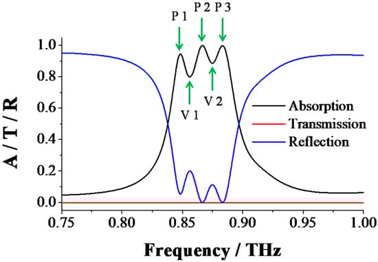 Simulated absorption/transmission/reflection spectra of our proposed wideband Mie resonance-based metasurface absorber. The absorption peaks 1, 2, and 3 at frequencies of 0.85 THz, 0.867 THz, and 0.883 THz are marked with green arrows and labels “P1”, “P2”, and “P3”, respectively. The absorption valley 1 and valley 2 at frequencies of 0.857 THz and 0.875 THz are marked with green arrows and labels “V1” and “V2”, respectively.