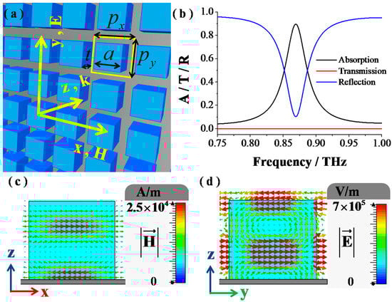 In order to better analyze this phenomenon, we then simulated the traditional Mie resonance-based metasurface. The schematic diagram is shown in Figure 3a. The dielectric blocks were arranged evenly and periodically on the aluminum substrate, with constant periods of both 40 μm. Each unit cell contained a single dielectric square block, whose sizes were a = 33 μm, t = 30 μm. The simulation setup was the same as previously mentioned. Figure 3b exhibits the absorption (black curve), transmission (red curve), and reflection (blue curve) spectra of the Mie resonance-based metasurface absorber with a single dielectric resonator in the unit cell. We can see that there was a reflection dip lower than 0.1 and an absorption peak of about 0.9 at around 0.869 THz, and the transmission was zero. We also simulated the electric field (E-field) and magnetic field (H-field) distributions of the single dielectric resonator at the frequency of the absorption peak. Cross-sectional H-field distribution in the x-z plane is shown in Figure 3c, and the cross-sectional E-field distribution in the y-z plane is shown in Figure 3d. At the frequency of 0.869 THz, the H-field was almost linearly parallel to the x-axis, and the vortical E-field was obviously distributed inside the dielectric block. This showed that a magnetic resonance occurred in the dielectric resonator at this frequency, illustrating that the absorption of this metasurface was related to the magnetic resonance.