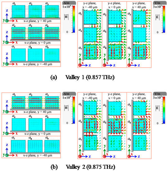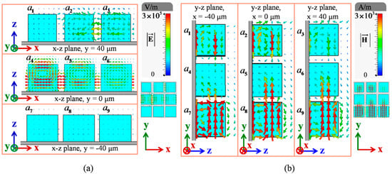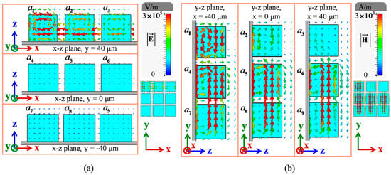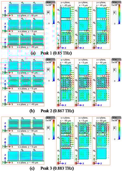 As for our combined metasurface absorber, the electromagnetic field distribution at the frequencies of three absorption peaks (the frequencies of peaks 1, 2, 3 were 0.85 THz, 0.867 THz, and 0.883 THz, respectively); these are shown in Figure 4a–c. Each part of Figure 4 displays the cross-sectional magnetic field distribution in the x-z plane with y = 40 μm, 0 μm, −40 μm and cross-sectional electric field distribution in the y-z plane with x = −40 μm, 0 μm, 40 μm for our combined metasurface absorber at different frequencies. At the absorption peaks 1, 2, 3, there were magnetic resonances, which were the same as the phenomenon inside the single block existing inside the third, second, and first row of squares, respectively. The magnetic resonance occurring in a smaller block corresponded to an absorption peak with a higher frequency. We also simulated the electromagnetic field distribution at the absorption dips between peaks 1 and 2 and peaks 2 and 3, as shown in Figure 5. We could observe that although there were linear magnetic field and vortical electric field inside the blocks, the phenomenon was different. In Figure 5a, it can be seen that the strongest H-field was located at the second row of blocks, while the third row of blocks had the strongest E-field. In Figure 5b, it can be seen that the strongest H-field in the first row corresponded to the strongest electric field in the second row. This phenomenon indicates that there was a strong coupling between blocks at these two frequencies. All in all, the magnetic resonances occurring inside blocks of different sizes caused absorption peaks at different frequencies, while the special resonance caused by the near-field coupling between blocks led to relatively weaker absorption valleys between absorption peaks. Therefore, incorporating similar structures of different sizes into each unit cell could broaden the absorption bandwidth.