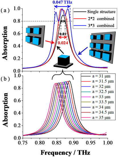 We compared the absorption spectra of the metasurface absorber with single dielectric resonator—four or nine dielectric resonators in one unit cell—as shown in Figure 6a. Bandwidth when absorption rate over 0.8 is also marked out. The size of this single dielectric resonator was 33 × 33 × 30 μm3. These four resonators of the combined metasurface absorber were 32.1 × 32.1 × 30 μm3, 32.7 × 32.7 × 30 μm3, 33.3 × 33.3 × 30 μm3, and 33.9 × 33.9 × 30 μm3. The combined metasurface absorber with nine resonators was the same as mentioned above. As we can see, as the number of different resonators increased in each unit cell, the frequency domain of absorption also widened significantly. The bandwidth of absorption rate above 0.8 was 0.012 THz, 0.024 THz, and 0.047 THz. Figure 6b shows the absorption spectra of the single resonator metasurface with different side lengths (from 31 μm to 35 μm). Comparing Figure 6a and Figure 6b, we can see that the absorption bandwidth of the metasurface combining nine resonators was comparable with the bandwidth covered by nine adjacent absorption spectra (Figure 6b), which was the same as the four blocks combined. Moreover, according to Figure 6, we can also observe that the greater the number of combined structures (or the larger the range of the structure size), the wider was the absorption frequency range of this combined metasurface absorber.