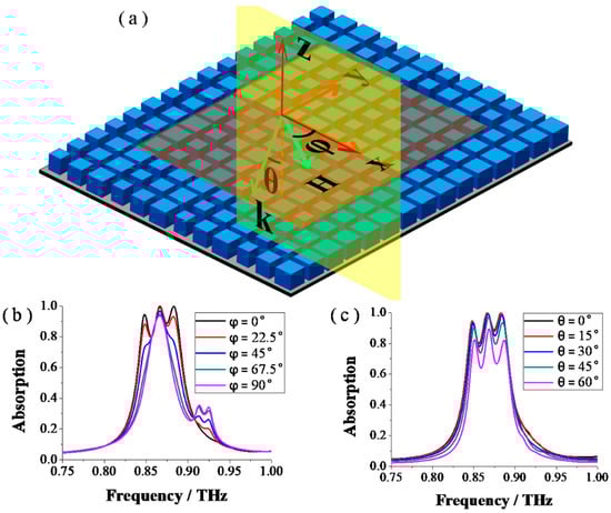 Next, we explored the influence of the polarization state and the incident angle of incident light on the performance of our combined metasurface absorber. Figure 7a is the schematic diagram of the irradiation of incident polarized light. The three red arrows represent the x-axis, the y-axis, and the z-axis, while the two green arrows represent the polarization direction of the magnetic field and the direction of the incident light. is the angle between the polarization direction of the magnetic field and the x-axis, while is the angle between the direction of the incident light and the opposite direction of the z-axis in the x-z plane. Figure 7b displays the absorption spectra at different polarization of normally incident light. When °, our combined metasurface absorber had the widest absorption bandwidth. However, as became larger, the absorption bandwidth of the wave absorber became narrower. The bandwidths at 80% absorption for the combined metasurface were 0.047, 0.045, 0.038, 0.022, and 0.018 THz when equaled 0°, 22.5°,45°, 67.5°, 90°, respectively. The appearance of this phenomenon may be related to the fact that this metasurface absorber is based on magnetic resonance. When the magnetic field was along the y direction (the direction in which the side lengths of the resonators increase jumpingly, for example, ), the absorption bandwidth was reduced to 40%. Despite this, the narrowest absorption bandwidth of our combined metasurface absorber was still nearly twice that of a single resonator. This proves that our combined metasurface absorber can effectively broaden the absorption bandwidth regardless of the polarization of the incident light. Figure 7c shows the absorption spectra at different incident angle of the incident light when °. When the light was normally incident, the absorption effect was the best. As the incident light gradually became tilted, the absorption rate slightly decreased, while the absorption bandwidth was almost constant. Even when the light was incident at a 45° angle, the absorption rate could still reach more than 75%. This shows that our combined metasurface absorber can still work well within a certain range of oblique incident angles.