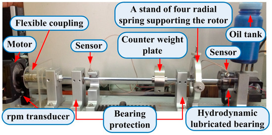 The photograph of the test platform for this study is shown in Figure 1. A stainless shaft with a 9.52 mm diameter and 490 mm length was supported by a relatively rigid Oilite bronze bushing and a cylindrical, fluid–lubricated bearing. The horizontal shaft was driven by a 90 watt AC induction motor with a variable speed controller. An rpm transducer at the left end was combined with a rotating disk, which has a square slit and mounted on the shaft, and a photo interrupter is used to detect the speed as the motor rotates. A flexible coupling connects the motor shaft and the stainless shaft. A single–oil wedge hydrodynamic bearing was set at the right end. The type of the hydrodynamic bearing was a circle wedge. Two eddy current sensors set on the outside case of the bearing and the other two eddy current sensors installed next to bearing protection are used to measure the displacements of the journal and shaft. An oil tank installed above journal bearing to store ferrofluid. A stand of four radial spring supporting the rotor was used to position the initial position of the rotor journal to the center of the fluid–film bearing during the experiment. In the midspan, one 0.78 kg counterweight plate was attached to the shaft. Two seals made of bronze as bearing protections were located at both sides of the mass disc to protect the rotor system.
