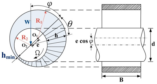 Assuming that the fluid is stable and flows as a laminar flow, the pressure distribution of the hydrodynamic bearing can be shown as in Figure 3. In the figure, O1 is the geometric center of the fluid bearing and R1 is the bearing radius, O2 is the center of the journal under a load W applied at the journal, the acute angle φ of line O1O2 and the load line is called the attitude angle, Ω is the rotating speed, d is the journal diameter, and R2 is the journal radius, c is the gap of the journal and bearing, eccentricity e is the distance of O1 and O2, h is the oil film thickness, and hmin is the minimum oil film thickness and equal to c minus e. Figure 4 displays the model of a symmetric rigid rotor system. According the research of Muszynska [28], the mathematical model which represents the balance of forces in the symmetric rotor can be expressed as