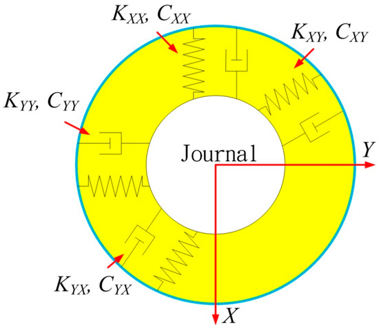 According to the study of Childs [29], the coefficients of stiffness and damping of a hydrodynamic bearing can be expressed as