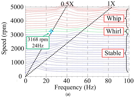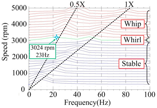 Figure 6 shows the spectrum plots and full spectrum cascade plots of the oil bearings using ferrofluid as the lubricating oil without any magnetic field. The rotating speed is increasing at 1 Hz/s. If the signals of the two eddy current sensors installed next to bearing protection do not show the shaft impacts to the protective bearing, the motor will drive the shaft to 100 Hz. When the speed of the rotor system reaches the mechanical first balance resonance point, the vibration increases, thus, generating self–excited vibration. In Figure 6, since the rotation speed is under 3024 rpm, the rotor–bearing system is actuated stably. However, when the rotation speed is 3024 rpm, self–excited vibration occurs. The vibration amount is higher than before 3024 rpm obviously. A whirl is generating and the rotor–bearing system is unstable. At the same time, the frequency of the whirl can be measured as 23 Hz by the machine 108 DAI. Thus, the precession speed can be calculated as 1380 rpm. The whip occurs when the rotation speed is 3184 rpm, and the lubricating fluid sub–synchronous frequency and vibration amplitude are proportional to the rotational speed.