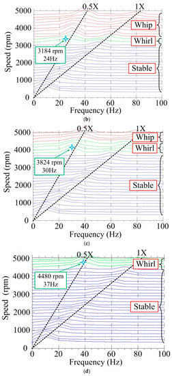 Regarding different magnetic field layouts, the magnetic fluid oil bearing is tested multiple times, and the magnets are placed in different positions under the bearing. According to the slots’ positions shown in Figure 2, the recorded experimental data are (a) three magnets are placed in positions No. 3, 5, and 7; (b) five magnets are placed in positions 3–7; (c) seven magnets are placed in positions 2–8; and (d) eight magnets are inserted into the slots. Magnets 1, 3, 5, and 7 are set as north poles toward the center of the bearing and magnets 2, 4, 6, and 8 are set as south poles toward the center of the bearing. The threshold of instability is distinguished according to the full spectrum cascade plots of Figure 7. The whirl occurs when the rotational speeds are 3168, 3184, 3824, and 4480 rpm, and the whip speeds are 3520, 3520, 4480, and 5268 rpm for the four cases. The experimental results show that if the magnetic field is just applied under the horizontal line of the bearing, the oil spin instability threshold risings are few with cases (a) and (b), which increase to about 144 rpm and 164 rpm; if the magnetic field is set around the bearing, the threshold risings are obvious with cases (c) and (d), which increase to about 800 rpm and 1456 rpm. The threshold risings expressed as percentages from cases (a) to (d) are 4.8%, 5.4%, 26.5%, and 48.1%, respectively.