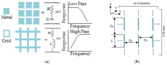 (a) FSS periodic structure consisting of complimentary array elements, their equivalent circuits and the frequency responses (Left to right). The patch array element exhibits a capacitive response (low pass), whereas the grid array element shows an inductive response (high pass) [31] (b) A true periodic structure showing inter-element spacing (Dx and Dz) and element length of L.