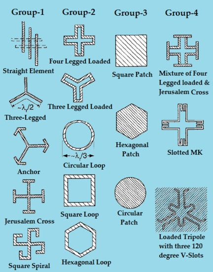 In general, four basic types of FSS element groups have been classified [2] and are illustrated in Figure 5. This includes Group-1 (centrally connected or N-poles, such as dipole, tripole, square-spiral, Jerusalem crosses), Group-2 (looped shapes, e.g., circular, square, hexagonal loops), Group-3 (solid interiors or patch shapes of different shapes), and Group-4 (combinations of above all). Depending on the potential application, FSS designers select array element from any of these groups and/or use a combination of these as well. A good element should present a stable resonance response with the variation in incidence angles. Commonly, selecting a group-2 element with a larger loop area is beneficial and it enhances the bandwidth [2].