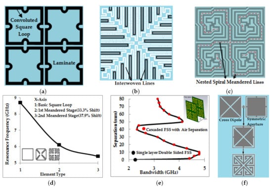 (a). Convoluted square loop FSS (b). Array element with interwoven geometry (c) The geometry of the miniaturized element based on meandered lines showing 2 × 2 unit cells [64] (d) FSS based on meandered elements showing the variation of resonant frequency with the inclusion of meandered stage [65]. (e) Bandwidth versus air separation of cascaded FSS [65] (f) Evolution process of the FSS unit cell in [67].