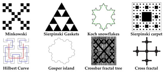 Fractal FSSs are famous for their self-similarity nature, thereby creating multi-band response and compactness. The multi-band frequency response of Sierpinski fractals has lucratively been used in the past for designing dual-band FSSs [72,73]. Additionally, the impact on the frequency response has been investigated via the scaling factor, iteration level, and width of the metallic patch [29,74,75]. It is proved with the increase in the electrical length of the fractal patch, a decrease of the working frequency is achieved, and for that reason, a lessening in the structural dimensions is observed. Figure 7a–h gives an overview of some of the fractal shapes used in recent researches.