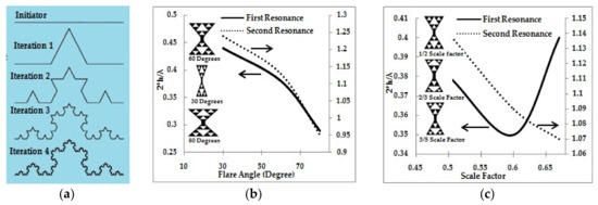 Fractals occupy a much smaller area because of their efficient space usage. The Koch dipole (Koch curve family) is much smaller than a straight wire dipole whereas both of them resonate at the same frequency. A Koch curve is generated by an iterative process, as shown in Figure 8a [76]. The whole length of a Koch curve at its Nth iteration is (4/3)N of the length at zeroth iteration (a straight line). Therefore, a Koch dipole starting and ending at the same point as its normal dipole counterpart effectively offers a much greater length and thus a lower resonance frequency. In fact, this results in a miniaturized element design.