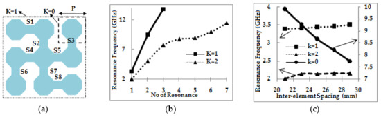 As seen in Figure 9b, with the increase of iteration level, the number of resonances increases from 3 to 7. Analysis of increasing the inter-element spacing shows that for k = 0, the resonance frequency lessens and the BW narrows down, as depicted in Figure 9c. However, for k = 1 and k = 2, a slight increase in resonant frequency is examined. Figure 9d gives the trend graph of varying angle of incidence and shows stability for fractal level 1 and 2, while deviations of 33% and 0.49% in resonance frequencies are found for k = 0 and k = 2, respectively. Similarly, an increase in BW is seen for higher oblique angles with level 1 and 2 as compared to level 0 and tendency is shown in Figure 9e. Such flexible fractal patch element can provide many combinations of reconfigurations, though the drawback is that a reconfigured patch loses its symmetry and hence dual polarisability.