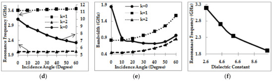 (a) FSS pre-fractal based patch element showing reconfiguration possibilities for k = 1 with switch positions (b) Number of resonances versus resonant frequency for different fractal levels. (c) Effect Inter-element spacing on resonance frequency. Effect of changing the angle of incidence for different fractal levels on (d) resonance frequency (e) Bandwidth [82]. (f) The effect on the resonant frequency by varying the dielectric constant [81].