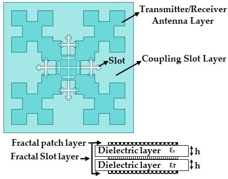 Nowadays, significant research in microwave engineering is reported in the design and development of new FSS designs based on the theory of fractal geometry due to its attractive features [29,68]. Geometric patterns generate fractals through an iterative procedure for an infinite number of times [69]. However, pre-fractal shapes originate by truncating the iterative method after a finite number of iterations. FSS with fractal elements was originally proposed in [62] to cut down the size of the structure by applying the space-filling curves of Hilbert and Minkowski. Later, the innovation in recently reported researches has brought unprecedented prospects for engineers to investigate unlimited possible fractal configurations that had not existed in earlier time. Important performance attributes that are realized by fractal arrays include efficient methodologies to element size reduction, multi-band behavior, low-side lobe designs, and improvement in fast beam forming algorithms by utilizing the recursive property of the fractals [70,71].
