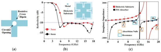 Figure 3a shows two basic types of element, equivalent circuits, and filters responses for low and high pass FSSs [2]. FSS patches create resistance (R) and inductance (L), while gaps among the FSS elements generate capacitance (C). Simple electrostatic principle applies to manipulate the physical significance of these passive values for different FSS elements, e.g., L of two parallel wires and C generated by a parallel plate capacitor. So, a required filter response is constructed by the combination of these capacitive and inductive elements. However, any change in the FSS dimensional parameters leads to an equivalent variation in the L and C values. Physically, when a unit cell of an FSS is illuminated by the EM wave, it can be converted to an equivalent resonance circuit. The resonance frequency can be found by (3), in which L and C represent the equivalent inductance and the capacitance of an FSS unit cell, respectively.