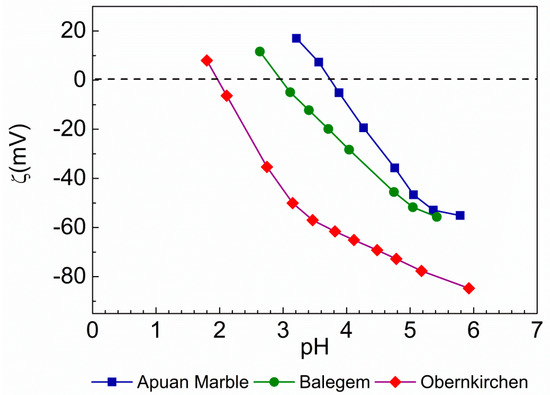 Streaming current measurements were performed on the three untreated lithotypes at various pH within different ranges, depending on the chemical stability of each given stone, to obtain their respective isoelectric points (IEP, Table 4); for this purpose, titration curves were drawn by fitting the zeta potential values calculated from the streaming current data (Figure 2). Even though the electrokinetic behaviour of porous materials is the result of a variety of factors, including the influence of surface conductance [32] and the effect of surface roughness [36], the differences observed among IEPs can be seen to reflect the mineralogical composition of the lithotypes under study quite closely. This indicates that the isoelectric point may be a suitable parameter for characterizing stones with different surface chemical composition, and in particular for distinguishing among those with different contributions of carbonate and silicate minerals. In particular, the isoelectric point of Obernkirchen, i.e., a stone largely consisting of quartz, is in good agreement with the values reported in the literature for silica and layered silicates [37,38]. In the case of Apuan marble, which is almost pure calcite, a comparison with literature data concerning calcite samples showed only partial agreement [39]; however, upon performing the electrokinetic titration on a single crystal of calcite, an IEP value in close correspondence to that determined on the marble was obtained.