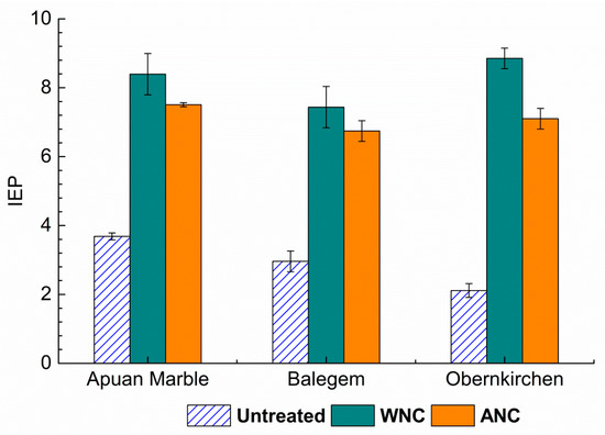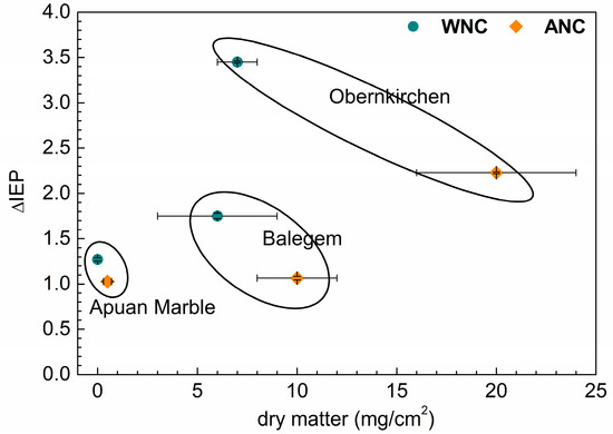 The relative variation ΔIEP (Equation (2)) for the six lithotype-treatment combinations reported in Figure 4 does not appear to be correlated in a simple manner with the amount of product applied. In particular, in the case of ANC, a large difference in dry matter from Apuan marble to Balegem stone only corresponded to a negligible increase in ΔIEP, while a comparable increase in the amount of product from Balegem and Obernkirchen gave rise to a comparatively large increase of ΔIEP; similarly, in the case of WNC, a minor increase of dry matter from Balegem to Obernkirchen resulted in a large increase in ΔIEP, actually much larger than that recorded from Apuan marble to Balegem in spite of a higher increase in dry matter.