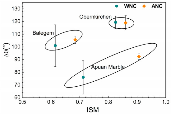 Consistent with the observations about ICrel, the trend of Δθ values for each lithotype also corresponds rather well to that observed for ISM (Figure 6). In particular, for Apuan marble, the large difference in Δθ between WNC and ANC reflects an equally large difference in ISM, while the limited to negligible variation observed for Balegem and Obernkirchen corresponds to a similarly small variation in Δθ. Finally, it can be observed that, on Apuan marble, both coatings produced an increase in static contact angle that was smaller than that observed on Balegem and Obernkirchen. This deviation may be tentatively ascribed to the much lower porosity of marble, leading to a rather effective coverage of the outer stone surface (and thus high ISM value), but a less effective hydrophobic modification for corresponding low surface energy coating material due to the lower surface roughness of stone and the resulting lower contribution to the measured contact angle by the Cassie–Baxter state [44,45].