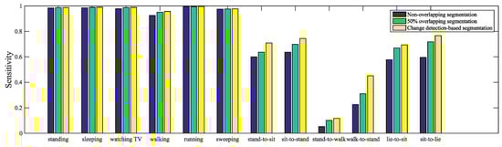 The sensitivity of each activity class obtained from three segmentation methods by applying SVM classifier.