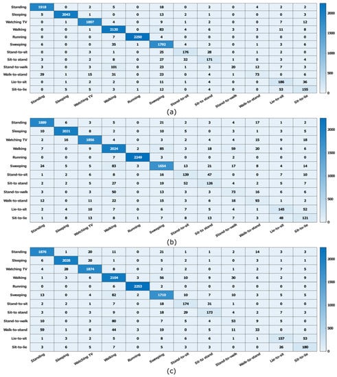 The confusion matrices of twelve activities obtained by SVM (a), DT (b) and KNN (c).