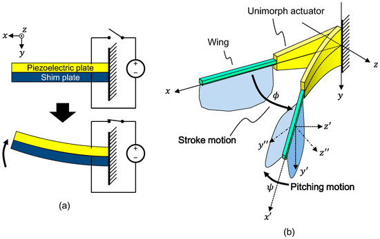 There are many candidate actuation principles for flapping-wing MAVs, including piezoelectric, electromagnetic, shape memory alloy, and electrostatic. Piezoelectric actuation appears most suitable for small-scale vehicles owing to its high power-to-weight ratio, and some studies have already used piezoelectric actuators. For example, Harvard University [1,2,3] developed “RoboBee” and demonstrated stable tethered flight of a piezoelectric-actuated vehicle with a 30-mm wing span. This robot is equipped with piezoelectric Pb(Zr,Ti)O3 (PZT) bimorph actuators and lever mechanisms to amplify and transmit the output displacement of the actuator to wings.