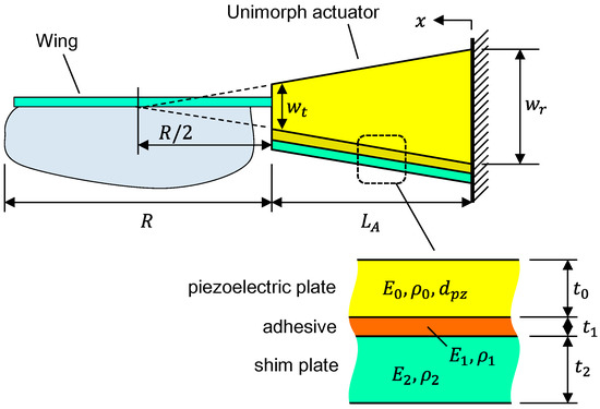 where and are Young’s modulus and the piezoelectric coefficient of the piezoelectric plate along the x-axis, respectively [25]. is the applied voltage to the piezoelectric material. are the z-positions of the layers of the unimorph, and they are expressed as . is the neutral axis about the bending of the unimorph, and it is expressed as