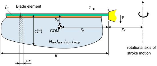 where and are the - and -position of the COM, respectively, and is the distance between the wing root and the center axis of the stroke rotation. Upon assuming that the wing is a flat thin plate, the inertia terms with respect to x′z″ and y″z″ can be considered to be zero, and is expressed as