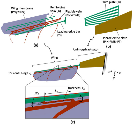 To verify the analytical model, we measured the performance of prototypes of the flapping-wing actuation system and compared the result to the analytical calculation. Figure 4 shows the structure of the system. The system comprises two parts: a piezoelectric unimorph actuator and a wing. The wing comprises four parts (shown in Figure 4a): Leading-edge bar, flexible vein, reinforcing vein, and wing membrane. The wing membrane is a thin polyester film, and it is supported by the veins. The veins consist of a combination of titanium (Ti) reinforcing layer and polyimide (PI) flexible layer. The wing can rotate around the x-axis at the hinge structure, which is also made of the PI layer. A magnified drawing of the hinge structure is shown in Figure 4c. The hinge of the prototype comprises a torsional beam structure. Thus, can be calculated simply as the spring constant of the torsional beams [31]: