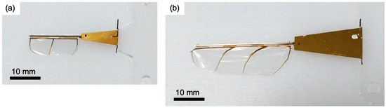 In this experiment, two prototypes with different size were measured for confirming the generality of the model. One has a 17.0-mm-long wing and a 10.5-mm-long unimorph and the other has a 32.4-mm-long wing and a 21.0-mm-long unimorph; they are respectively called “small type” and “large type” below. The other design parameters and material properties are summarized in Appendix A. Figure 5 shows photographs of the small and large types.