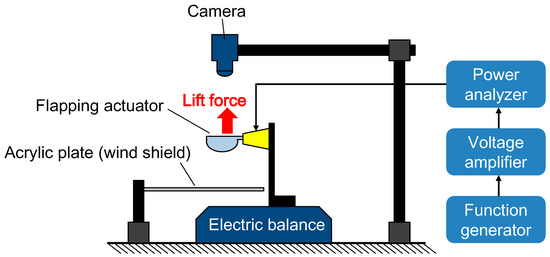 Figure 6 shows the experimental setup for the wing motion, lift force, and power consumption. We captured the wing motion using an experimental setup with a high-speed camera. The average lift force and consumed power were measured using a precise electrical balance (HR-100A, A&D Co., Tokyo, Japan) and a power analyzer (PA1000, Tektronix, Beaverton, United States), respectively. To block the wind produced by the wing, an acrylic plate was placed between the wing and the electric balance.