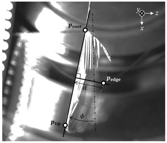 Figure 7 shows a typical image of the actuated wing. We tracked the tip and root and the tip position of the leading edge, and , respectively, and a position on the lower edge of the wing, , based on the images to estimate and . was simply calculated as the angle between and the x-axis. was estimated by