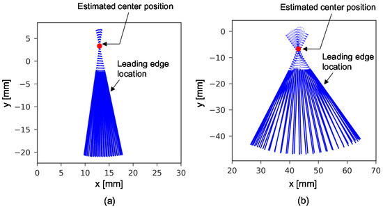 Estimated center position of wing stroke rotation from captured images: (a) small type with and (b) large type with . Blue solid lines indicate the location of the leading edge and dotted lines, their extensions. The red point indicates the estimated center position.