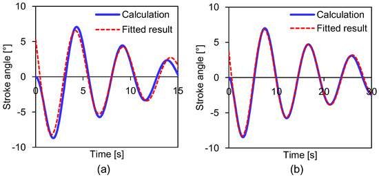 The resonance frequencies were identified by the stroke amplitude response against the frequency-swept input signal in the experiment; we defined the resonant frequency as the frequency with the maximum stroke amplitude. In the calculation, we estimated the resonance frequencies from impulse system responses. The motion equation was solved with an initial condition of at and an impulse input of V. The resonant frequency can be derived by fitting to a function of : , where , , and are parameters that are also estimated in the fitting operation. This method has an advantage of shorter computational time comparing to calculating the response to the frequency-swept input. Figure 9 shows the calculated impulse responses and their fitted curves.