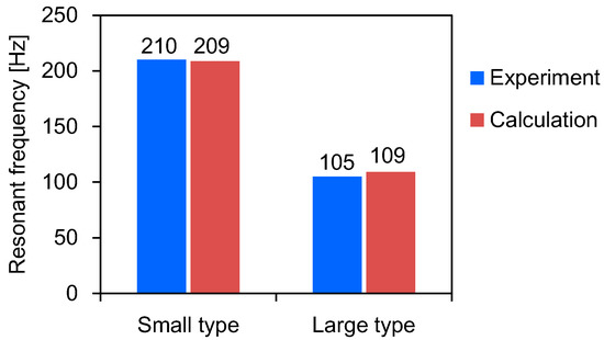 Figure 10 shows a comparison of the measured and calculated results. Blue and red bars show the measured and calculated data, respectively. The measure resonant frequencies of the small and large types were 210 and 105 Hz, respectively. The corresponding calculated resonant frequencies were 209 and 109 Hz. The small type showed roughly two times higher resonance frequency than the large type. The calculations were in very good agreement with the experiments; the errors of the small and large types were −0.7% and 3.8%, respectively. This result indicates that the kinematic part (inertias and springs) of the system has been modelled accurately.