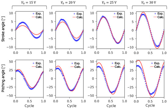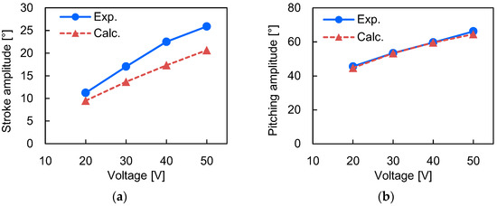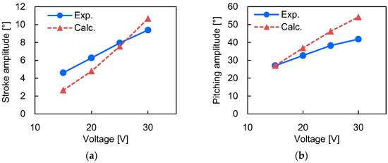 Relationship between applied voltage amplitude and (a) stroke amplitude and (b) pitching amplitude of large-type actuator. The frequencies of the input signal in the experiment and calculation were 105 and 109 Hz, respectively.