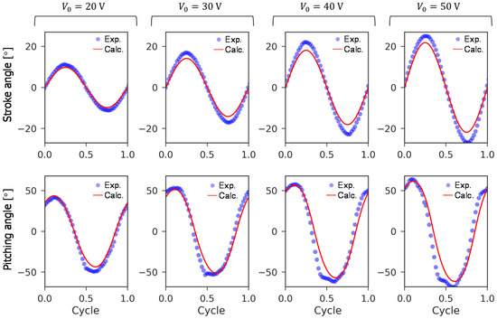 Measured and calculated stroke and pitching angle of large-type actuator: blue circle and red line show experimental data and calculated result, respectively.