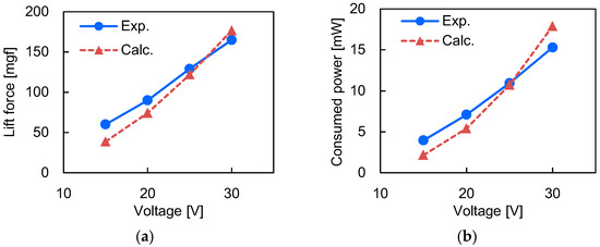 Relationship between applied voltage amplitude and (a) lift force and (b) consumed power of small-type actuator. The frequencies of the input signal in the experiment and calculation were 210 and 209 Hz, respectively.