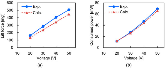 Relationship between applied voltage amplitude and (a) lift force; (b) consumed power of large-type actuator. The frequencies of the input signal in the experiment and calculation were 105 and 109 Hz, respectively.