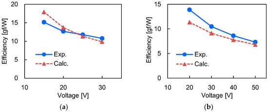 Relationship between applied voltage amplitude and lift-to-power efficiency: (a) small-type and (b) large-type actuators.