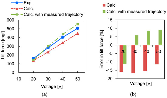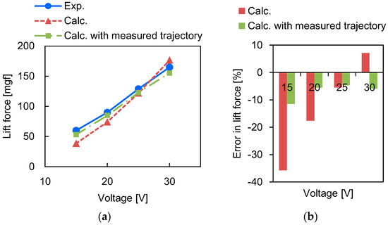 Comparison between fully analytical calculation and calculation based on measured trajectory of small-type actuator: (a) lift force and (b) error of lift force in experimental result.
