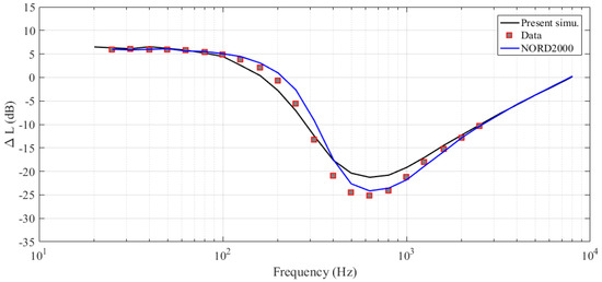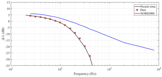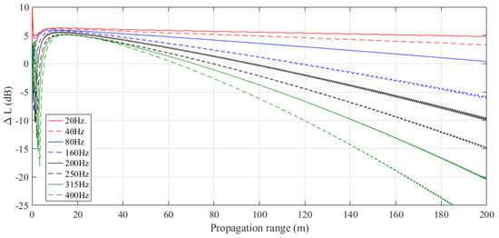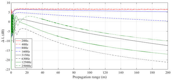 Such a temperature gradient leads to a downward sound propagation. As a result, the RSPL along the propagation direction will probably increase. In Figure 5, it is seen that there is a general increase of along the propagation path except near the source locations (x < 40 m). The values are gathered at x = 200 m distance and are depicted in Figure 6. It is found that the values are positive between 20 Hz and 5 kHz. The current prediction fits well with the reference data.