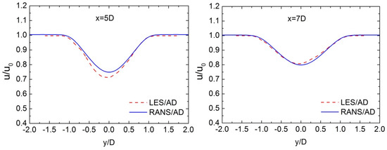Comparisons of the normalized wake velocity from LES and RANS simulations, for down-stream locations of 5D and 7D after a single wind turbine.